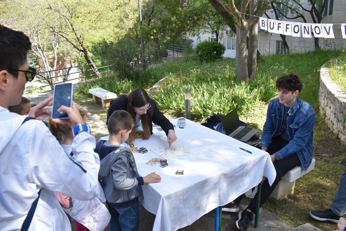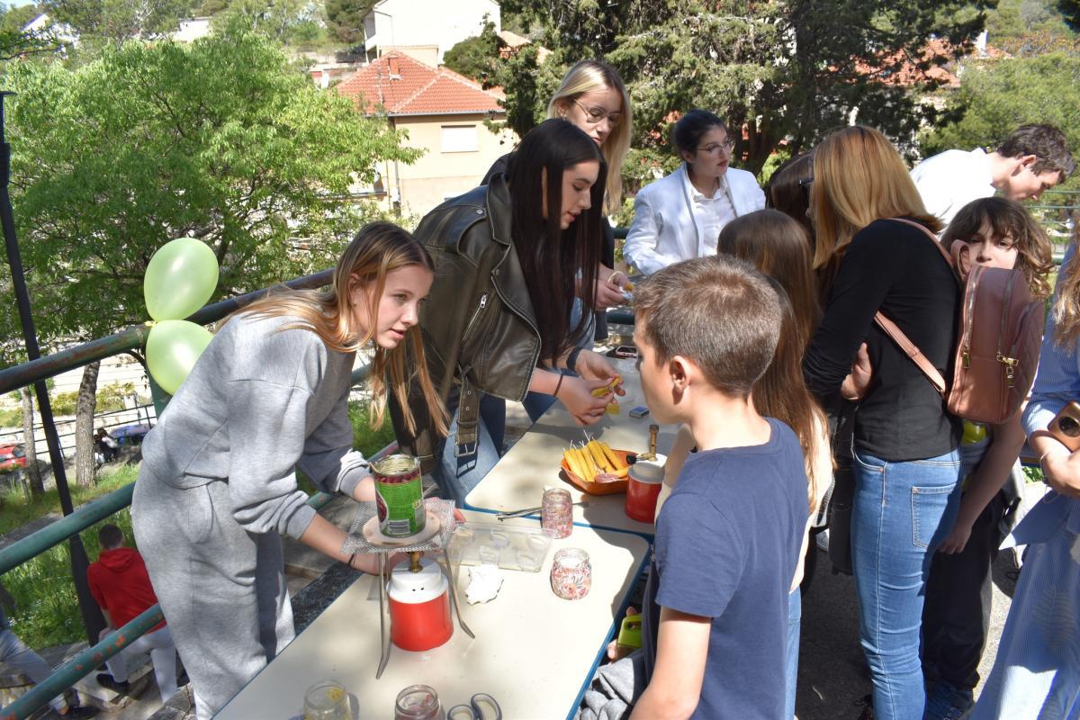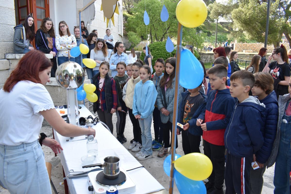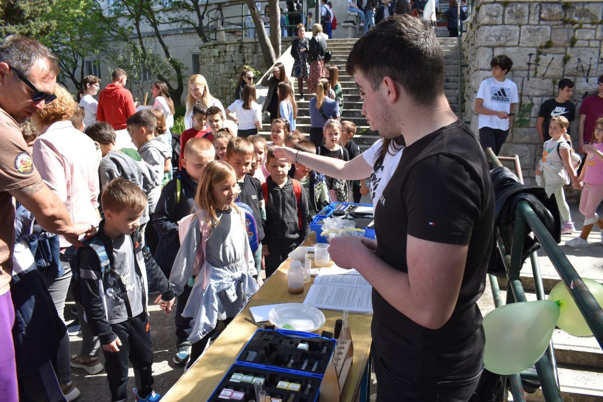 Ove godine nas je vrijeme poslužilo pa smo obilježili Festival znanosti s puuno zabavnih i poučnih aktivnosti, baš onako kako znanost i zaslužuje! Mnoštvo mališana iz šibenskih vrtića, osnovnih škola, ali i naši znatiželjni učenici, imali su prilike sudjelovati u raznim demonstracijama i pokusima te naučiti kako su sve priroda i društvo povezani. Bilo je tu: praktičnih radionica i demonstracija iz kemije, pokaznih vježbi prevencije nesreća na vodi, prezentacija gradnje suhozida, ekoloških igara i poduka o kompostiranju u sklopu biologije, demonstracija i interaktivnih pokusa iz fizike i matematike te predavanja o suživotu čovjeka i prirode Udruge Biom. Ovu manifestaciju nisu propustili posjetiti i dožupanica, Iris Ukić Kotarac te viši savjetnik za obrazovanje i nove tehnologije, Vinko Bulat. A sve ovo bilo je moguće zahvaljujući spremnosti naših vrijednih učenika-demonstratora koji su se rado odazvali na sudjelovanje, naših nastavnica koje su ovo organizirale: nastavnica biologije Tine Šantić i Ane Bogadi, nastavnica kemije Ane Plenče Mudrić i Natalije Hobar, nastavnice fizike Bojane Oreb i nastavnice matematike Lorane Antunac te neizmjeroj podršci ravnatelja Zorana Smolića.